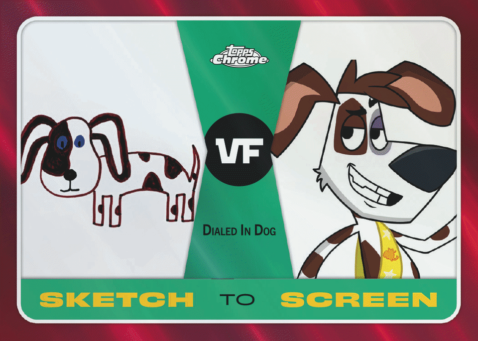 The Sketch to Screen insert in Topps VeeFriends Chrome 2025 showcases the artistic evolution of 10 VeeFriends characters, from Gary Vaynerchuk's original hand-drawn sketches to their animated form in VeeFriends Cartoons. Each horizontal card features side-by-side artwork that captures the brand's creative journey, celebrating both its origins and its growing cultural footprint.