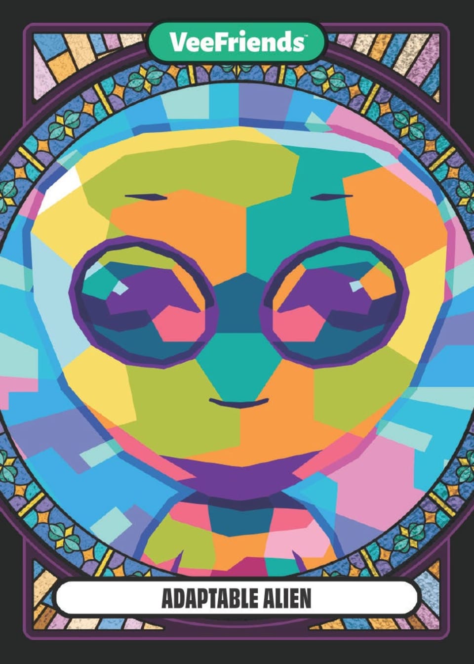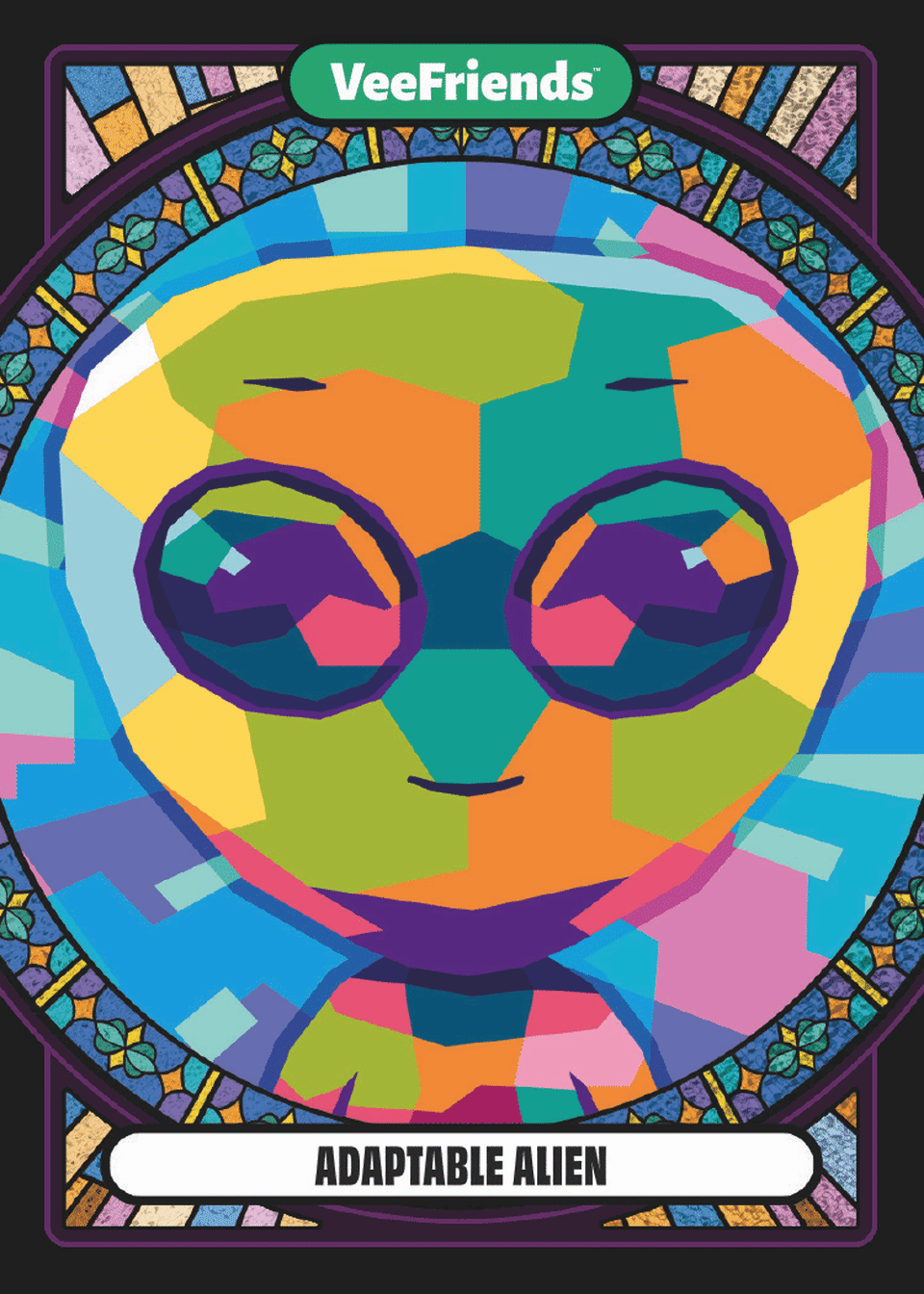 The Iconics insert in Topps VeeFriends Chrome 2025 transforms 20 VeeFriends characters into radiant stained glass masterpieces, inspired by the original VeeFriends Iconics NFTs. Designed by acclaimed artist Gilang Bogy, each card features intricate geometric patterns, jewel-toned hues, and a premium chrome finish that mirrors the elegance of cathedral-style glasswork.