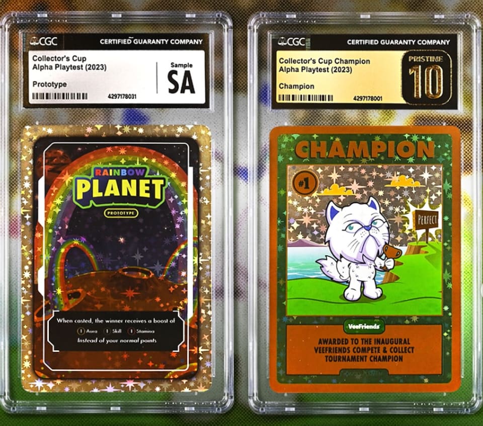 In the 2023 Compete and Collect Collectors Cup, the champion received the Alpha Playtest Perfect Persian Cat Champion Trophy Card, graded Pristine 10 by CGC. In this first-ever VeeFriends-hosted VeeFriends TCG event, every competitor also took home the Rainbow Planet Alpha Playtest card.