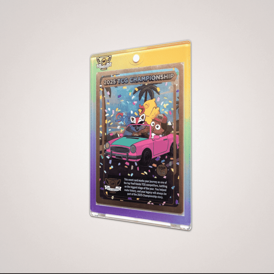 This exclusive 2025 VeeFriends TCG Championship Event Card will be given as a participation reward, presented in a custom stand-up display mag case. The premium holder not only protects the card, it elevates it into a commemorative showpiece that celebrates one's achievement as a 2025 Championship competitor.