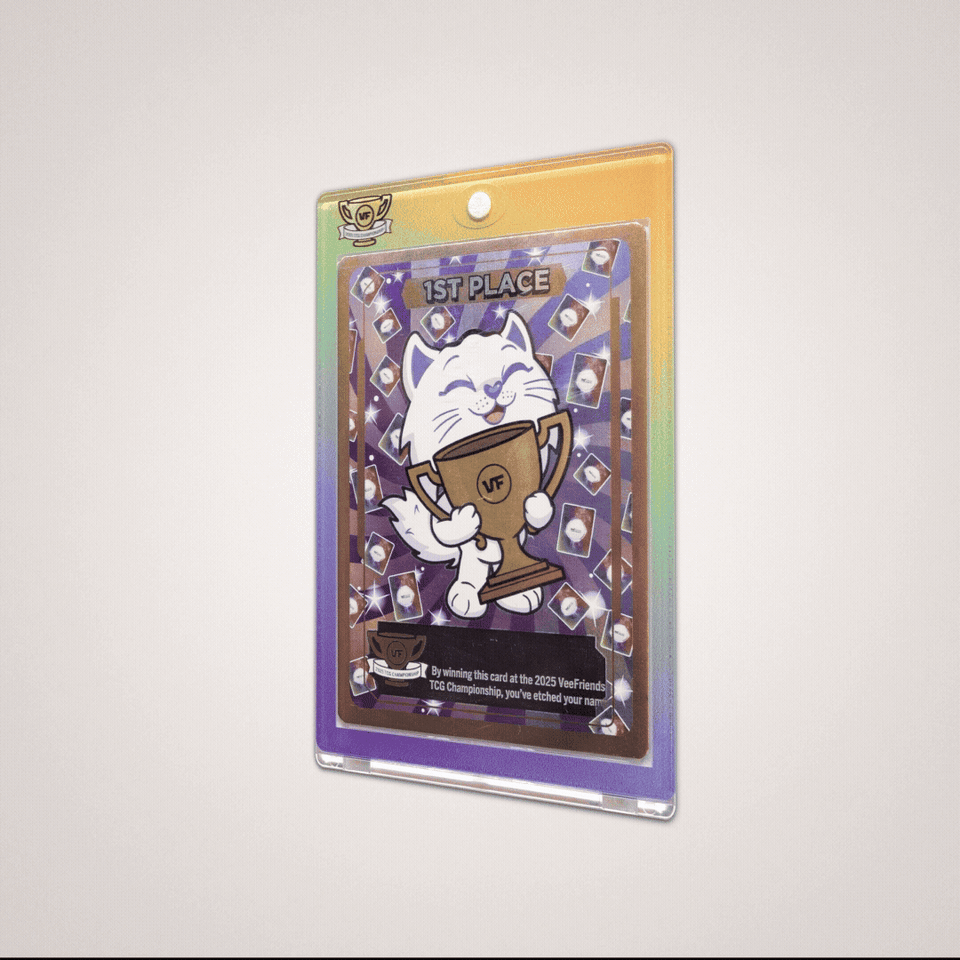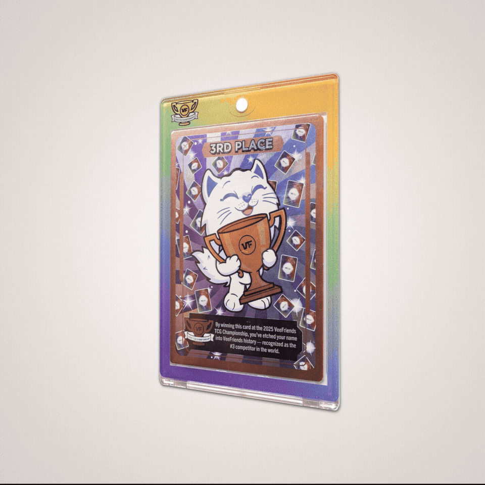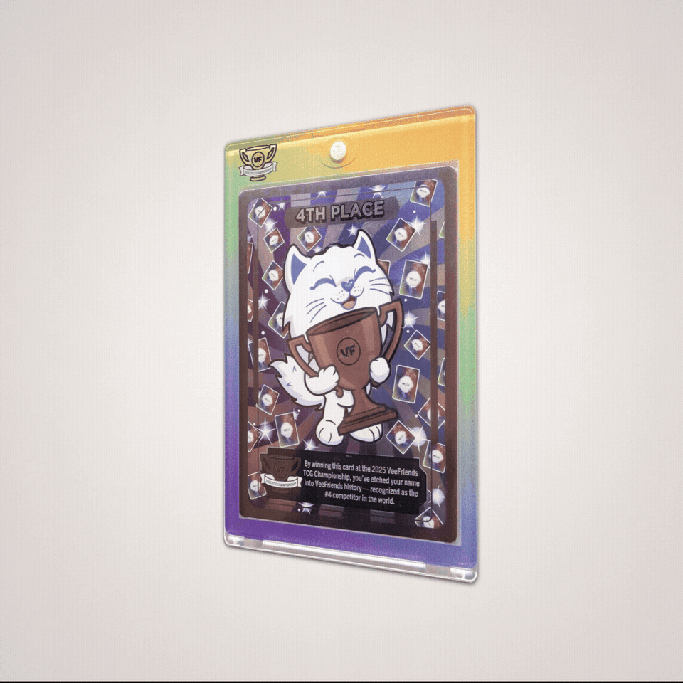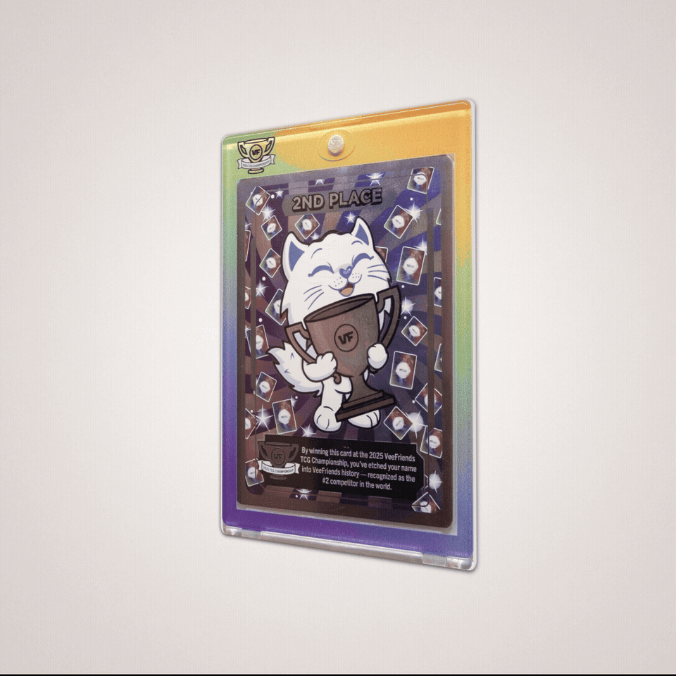 The 1st - 4th place finishers will each receive an exclusive Trophy Card. These cards feature the Perfect Persian Cat holding a VeeFriends trophy in a victorious celebration. The cards are presented in a custom stand-up display mag case, a premium magnetic holder built to protect the card while elevating it as a trophy piece. The mag is also designed to stand upright so champions can proudly showcase their achievement.