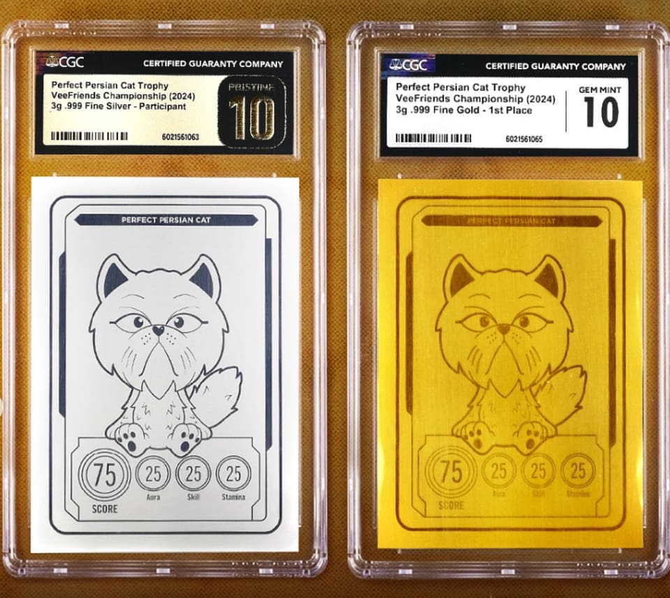 At the conclusion of the 2024 VeeFriends TCG Championship, the champion received a CGC-graded Perfect Persian Cat trophy card crafted with real gold. All participants also received a CGC-graded Perfect Persian Cat trophy card crafted with real silver.