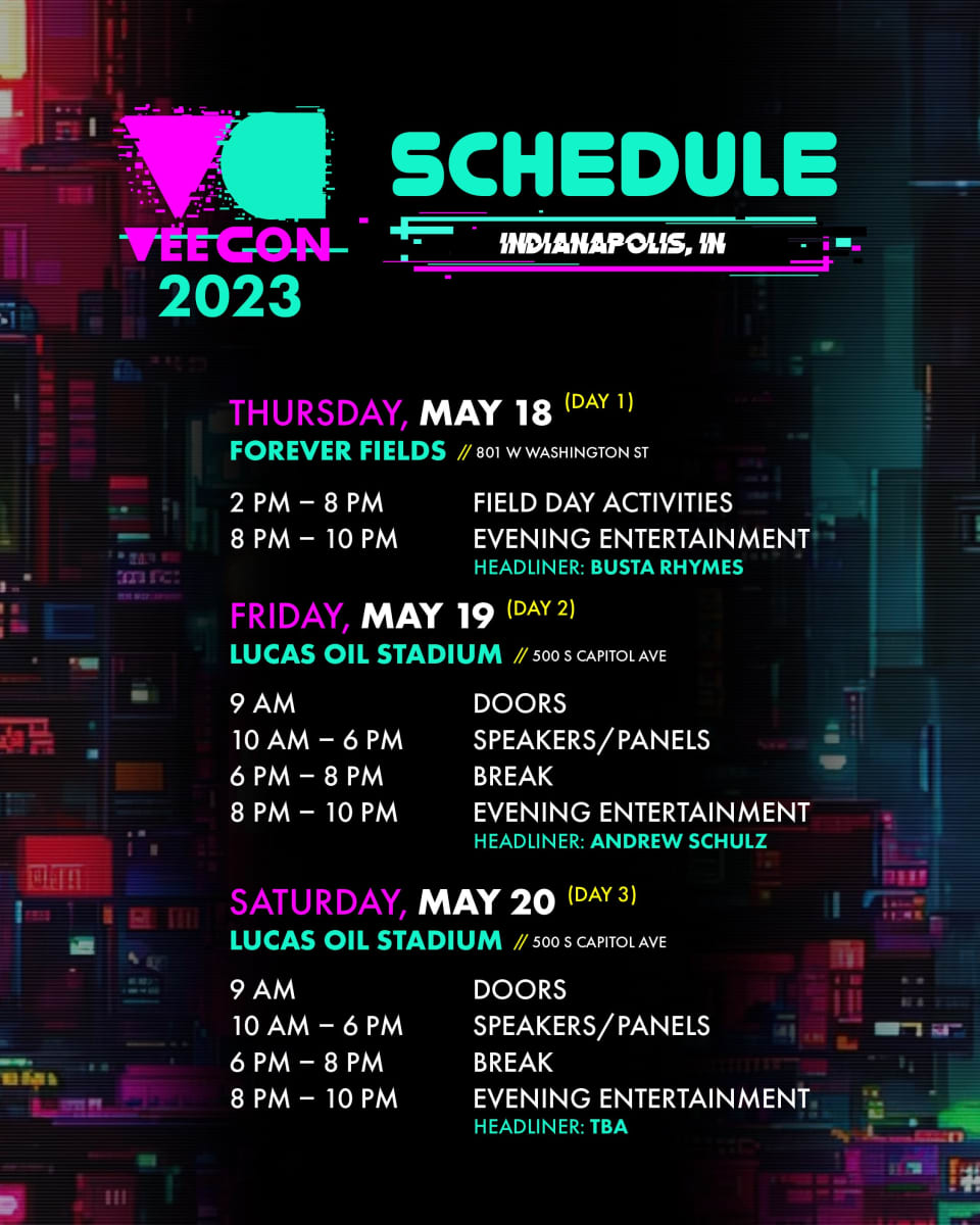 VeeFriends is thrilled to announce the return of the highly anticipated VeeCon 2023 to be hosted at "the racing capital of the world" in Indianapolis, Indiana. VeeCon 2023 will take place across world-class locations, including Lucas Oil Stadium and TCU Amphitheater at White River State Park, Indianapolis from May 18, 2023, to May 20, 2023.