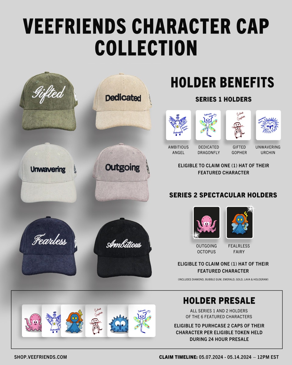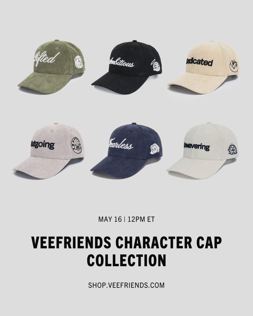 Starting from May 7th at 12 PM ET until May 14th at 12 PM ET, eligible VeeFriends NFT holders have the opportunity to claim a free VeeFriends Character Cap corresponding to their character: