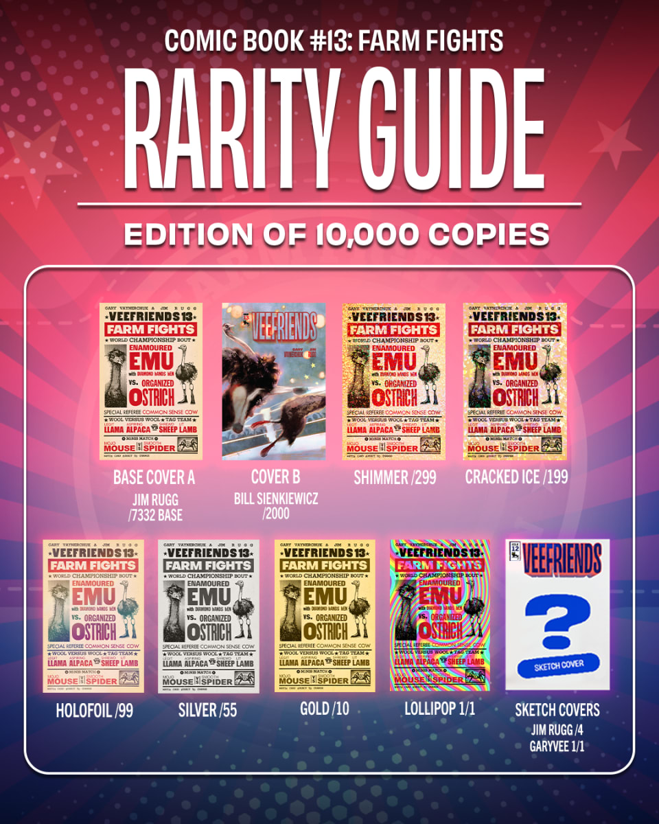 Every copy of VeeFriends Comic Book #13: Farm Fights comes sealed inside a Comic Collector Pack, which is a blind bag format that turns every purchase into a pull. Inside, collectors have the chance to find: