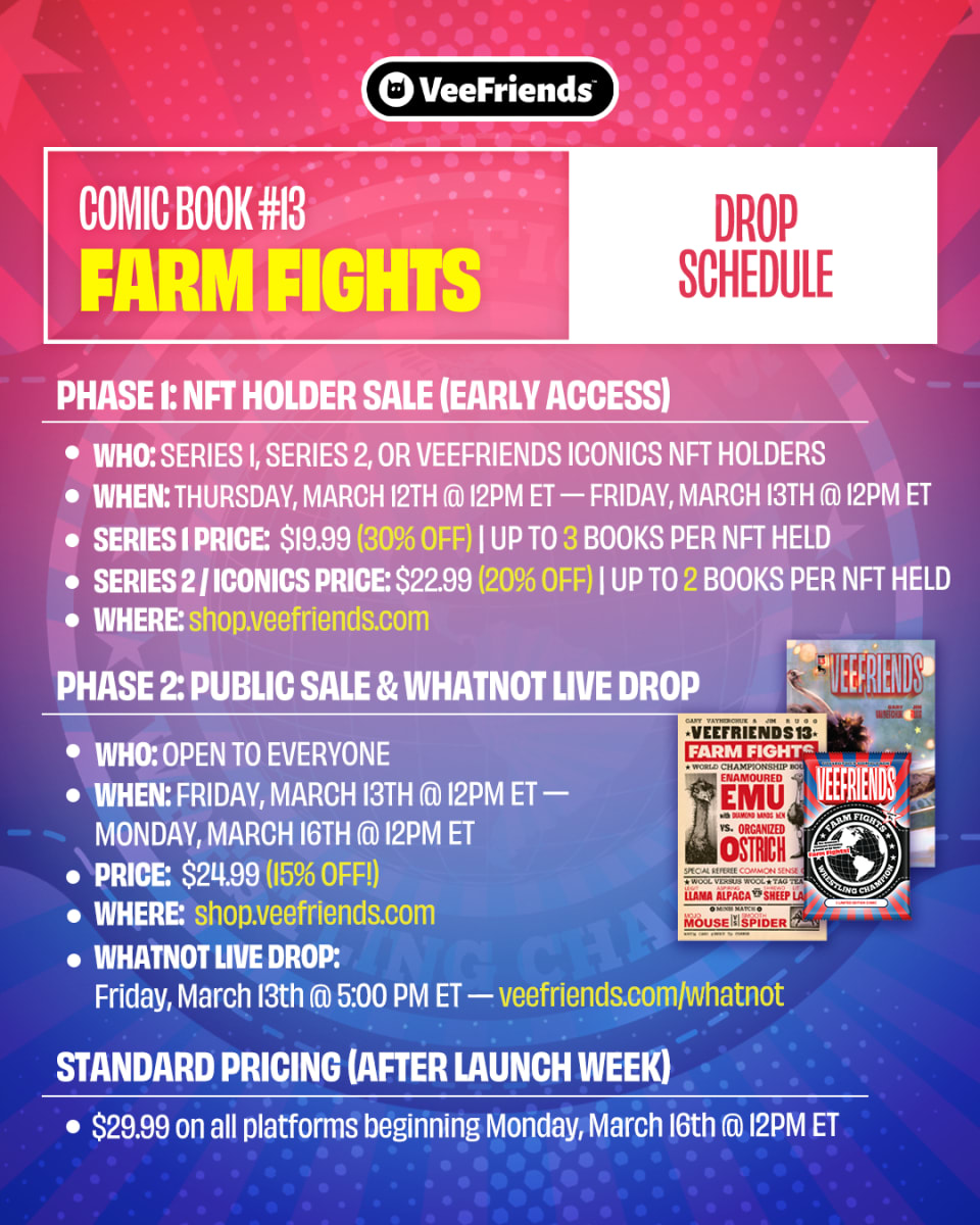 Written, drawn, and conceived entirely by VeeFriends Creative Producer Jim Rugg, Comic Book 13: Farm Fights launches Friday, March 13th on the VeeFriends online shop with a live Whatnot drop hosted by GaryVee that same day at 5pm.