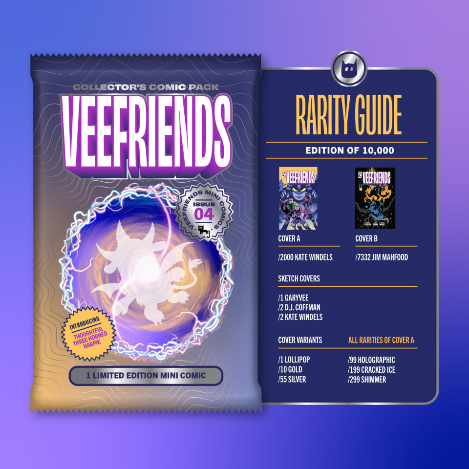 Each copy of VeeFriends Comic Book #4 comes sealed in a blind-bagged Comic Collector Pack. Every pack offers surprise and scarcity, including the debut of the ultimate chase... The 1-of-1 Lollipop Edition. Which cover do you hope to pull?
