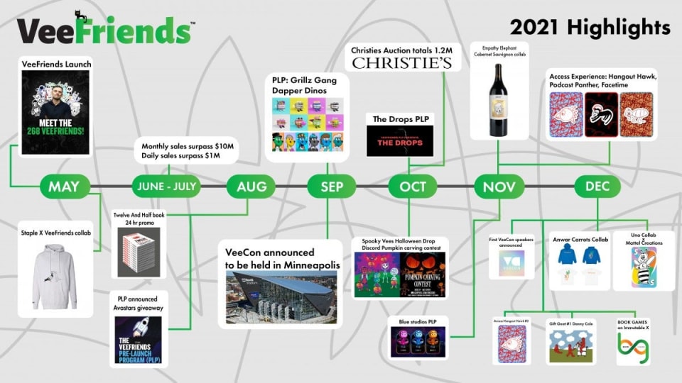 What started as an ambitious goal of creating an innovative NFT project with access, gifts, utility, and a world-class NFT conference has turned into much more - a true community has been built. We have seen strangers across the globe connect and friends become family. We've learned so much and have all grown together along the way. It's been a special year with so much that has happened and we'd like to roundup the year, but before we do we want to thank you for your support and belief in VeeFriends - without you there is no us. We look forward to the years ahead.