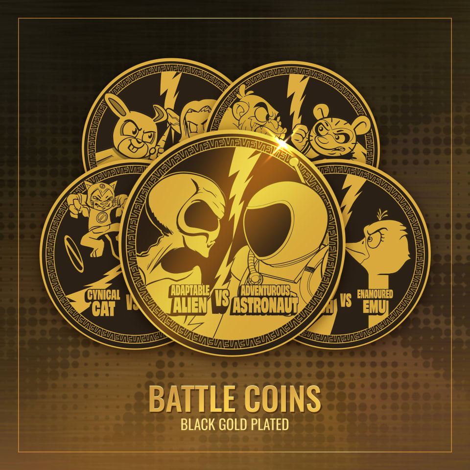 Five black gold-plated dual-sided collectible coins featuring head-to-head character matchups: