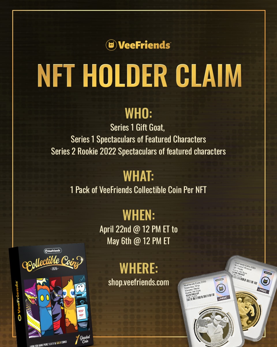 Product: 2026 VeeFriends Collectible Coins Grading: NGC Graded Gem Proof Coin Characters: 55 VeeFriends characters + 1 exclusive pure silver character (Eager Eagle)3 Art Styles: Classic, Comic, OG 3 Metal Finishes: Zinc metal coin plated with the following, Pure .999 Fine Silver Plated, Pure .999 24K Gold Plated, Black Gold Plated What's inside: 1 NGC Graded Gem Proof Coin (with a chance to pull a Pure .999 24K Gold Coin, Pure .999 Fine Silver Coin, or rare Battle Coin), and 1 randomized Very, Very, Very, Very Mini Comic 3 Special Inserts: five different Battle Coins, one pure .999 Fine Silver Coins, or Pure .999 24K Gold Coin (pure coins weigh about ~20 grams) Price: $55 Per Pack, $550 Per Box (10 packs per Box), $5,500 Per Case (100 packs per Case) Where: TikTok Shop in the U.S. (mobile-access only, domestic U.S. addresses only) Pre-order Window: April 22nd to April 29th Ship Date: August 20th, 2026 Holder Claim: 1 pack per eligible Series 1 Gift Goat, Series 1 Spectacular of featured characters + Series 2 Rookie 2022 Spectacular of featured characters Holder Claim Window: April 22nd - May 6th, 2026