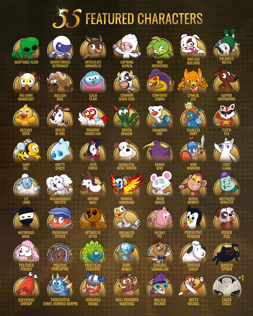 Adaptable Alien · Adventurous Astronaut · Articulate Armadillo · Aspiring Alpaca · Bad Intentions · Bad-Ass Bulldog · Balanced Beetle · Big Game Bandicoot · Bullish Bull · Calm Clam · Common Sense Cow · Confident Cobra · Cynical Cat · Dapper Dachshund · Decisive Duck · Dialed In Dog · Diamond Hands Hen · Driven Dragon · * Eager Eagle * · Enamored Emu · Fearless Fairy · Flex'n Fox · Gary Bee · Gritty Ghost · Hype Horse · Insightful Irish Terrier · Karma Kiwi · Kind Warrior · Legit Llama · Lit Lamb · Magnanimous Maltese · Mature Mule · Mindful Minokawa · Mojo Mouse · Moral Monkey · Motivated Monster · Notorious Ninja · Observant Oyster · Optimistic Otter · Organized Ostrich · Patient Pig · Persistent Penguin · Poised Pug · Polished Poodle · Positive Porcupine · Practical Peacock · Rare Robot · Sensible Sommelier · Shrewd Sheep · Smooth Spider · Sufficient Shrimp · Thoughtful Three-Horned Harpik · Versatile Viking · Well-Rounded Warthog · Willful Wizard · Witty Weasel