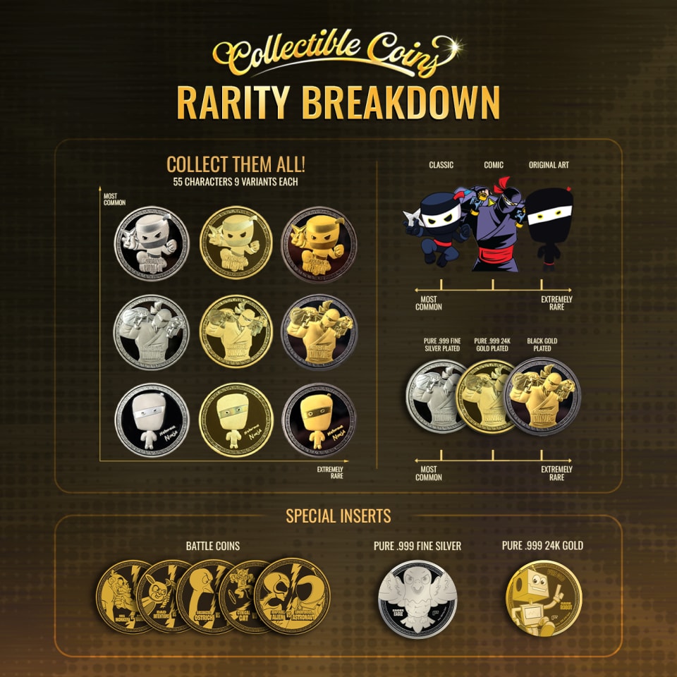 These collectible coins mark the world's most advanced collectible coin series built entirely around a character IP. Each of the 55 characters appears across three art styles (Classic, Comic, and OG) and three metal finishes (.999 Fine Silver Plated, .999 24K Gold Plated, and Black Gold Plated). All of these coins are graded by industry leader NGC, creating a premium collectible experience that feels stylish, layered, and unique. In each pack, you can also find a randomized Very, Very, Very, Very, Mini Comic that delivers a story about one of the 55 featured characters.