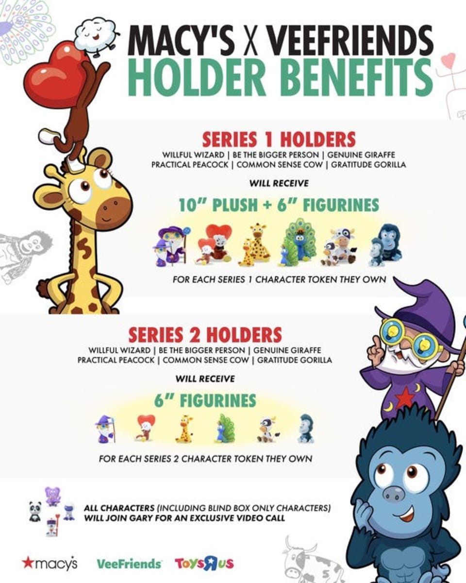 VeeFriends is proud to announce our partnership with Macy's and Toys"R"Us®, to launch our very-first limited series of figure and plush collectible characters. This collection launches on October 17th (U.S. pre-order starts today), and brings the VeeFriends characters to life, from digital NFT to physical collectibles, allowing for the first time anyone the chance to own a VeeFriends character. Each collectible plush or figure also has a printed QR code that currently leads its owner to a 3D animated heartfelt short film or character song.