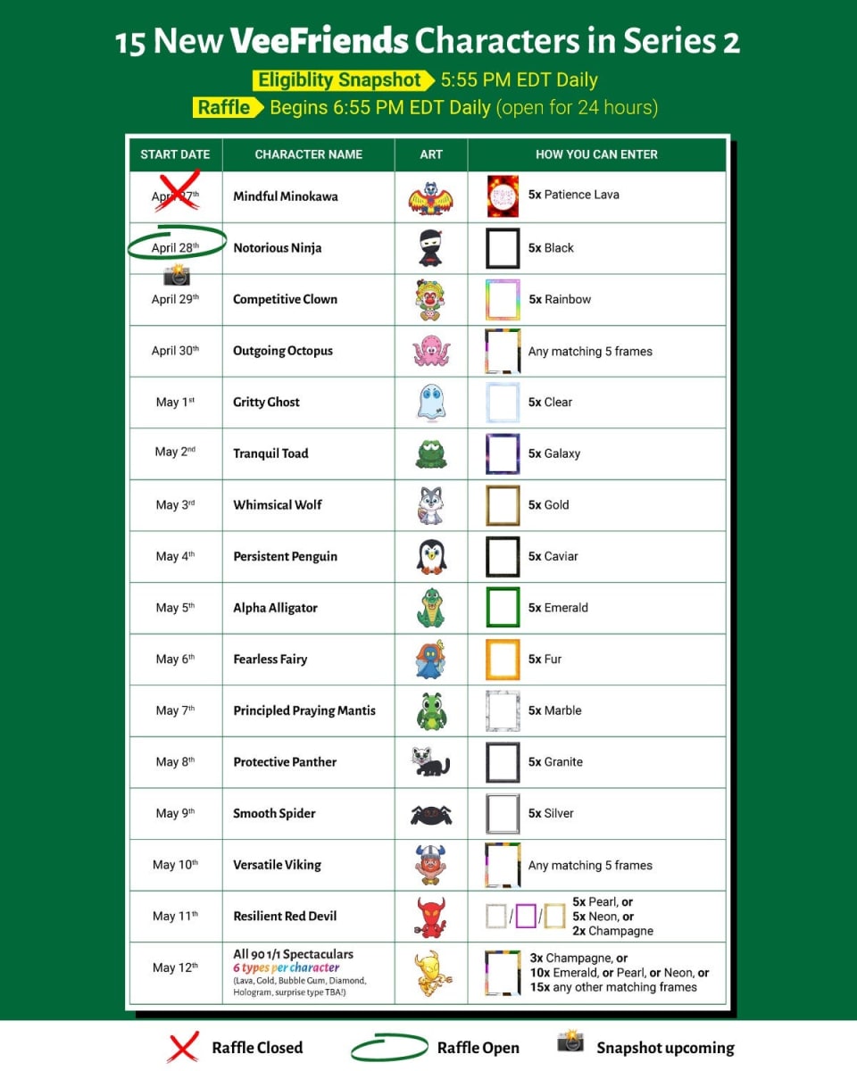 There will be 90 entries selected to claim their random new character spectacular(s). This is the ONLY way to access the new character spectaculars; there will not be any in the daily raffles. Generated entries will have their tokens reserved to claim until 05/31/2022. After the deadline, the NFT will be unclaimable and transferred to a special VeeFriends Wallet. If a raffle does not fill all 90 slots, all entries will be successfully selected, and the remainder will be transferred to a special VeeFriends Wallet.