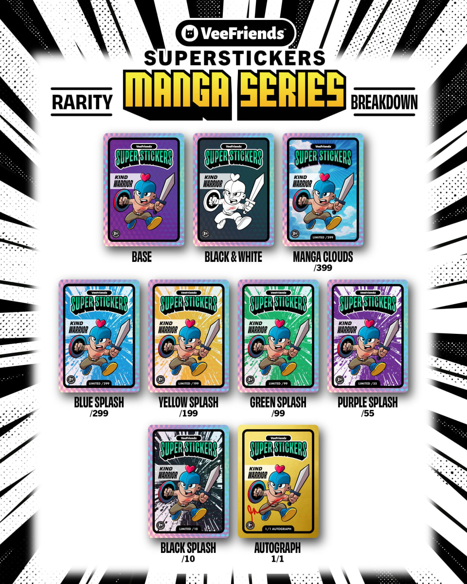 Following a successful collectible trading card release this summer with Topps Chrome, Super Stickers: Manga Series takes the VeeFriends collectibles universe up another notch. Inspired by manga and sports culture, this release delivers bold expression, fresh artwork, and a completely new way to experience the VeeFriends characters.