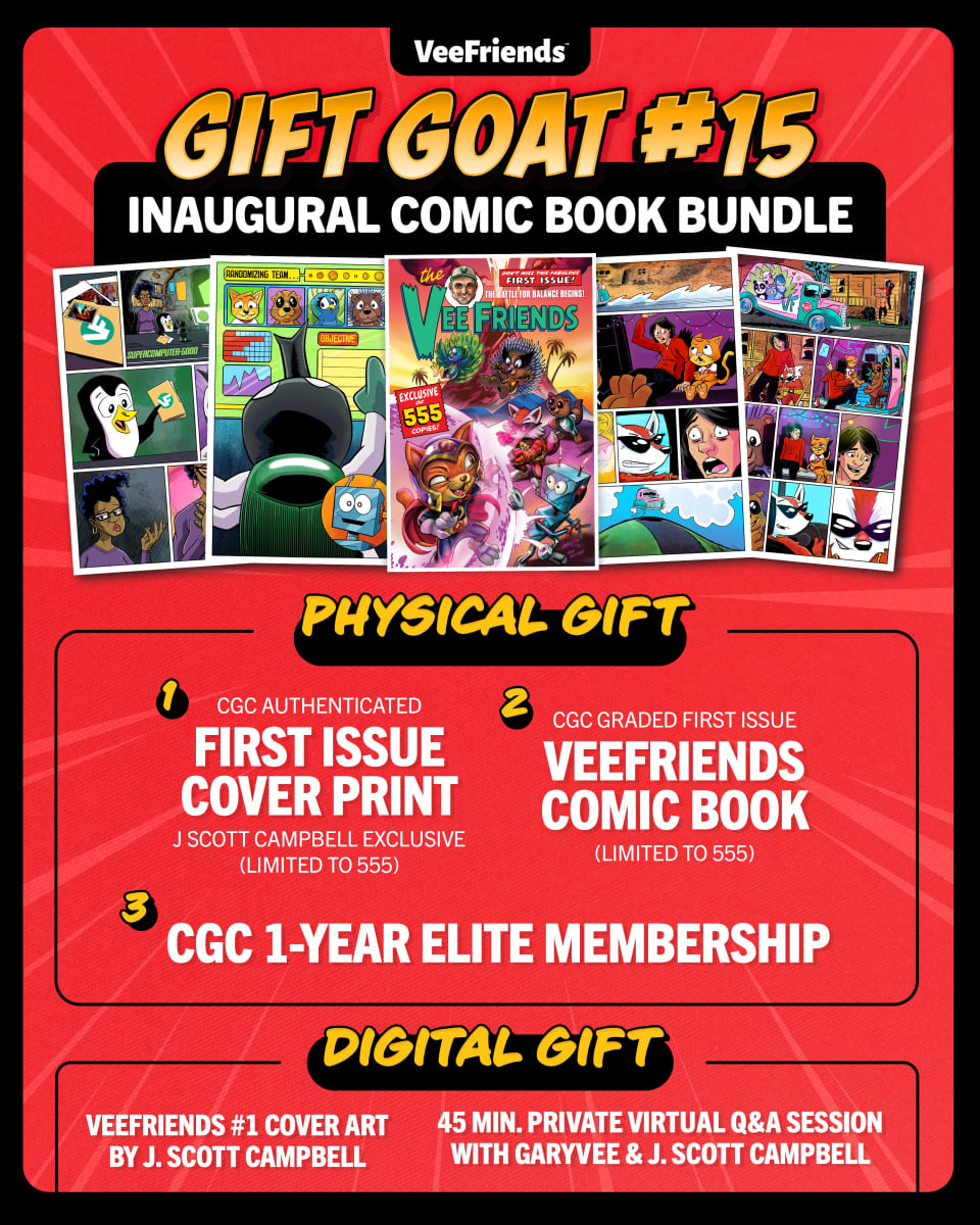 In this important release, not only will Gift Goats receive 1 of just 555 copies of the first issue of VeeFriends #1 comic book, graded by CGC, but also a CGC-authenticated VeeFriends #1 cover print by J. Scott Campbell, limited to 555 copies. Additionally, Gift Goats will enjoy a one-year CGC Elite membership, airdrop of the VeeFriends #1 cover art Illustrated by J. Scott Campbell as the Gift Goat 15 NFT, and the opportunity to speak with the renowned artist J. Scott Campbell himself, making this a comprehensive Comic Book Collector's Bundle.