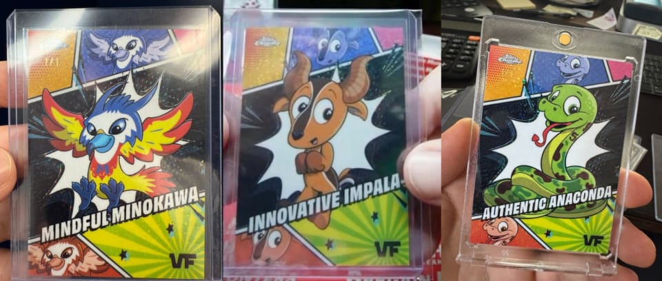 Three Manga Speckle pulls Mindful Minokawa, Innovative Impala, and Authentic Anaconda, have surfaced recently in the Topps VeeFriends Chrome 2025 chase. These ultra-rare, Japanese comic art-inspired parallels are some of the most coveted hits in the set.