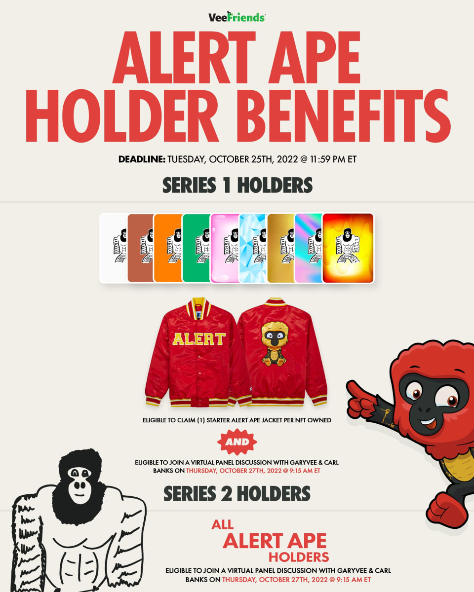 Eligible to claim (1) Starter Alert Ape Jacket per NFT owned.