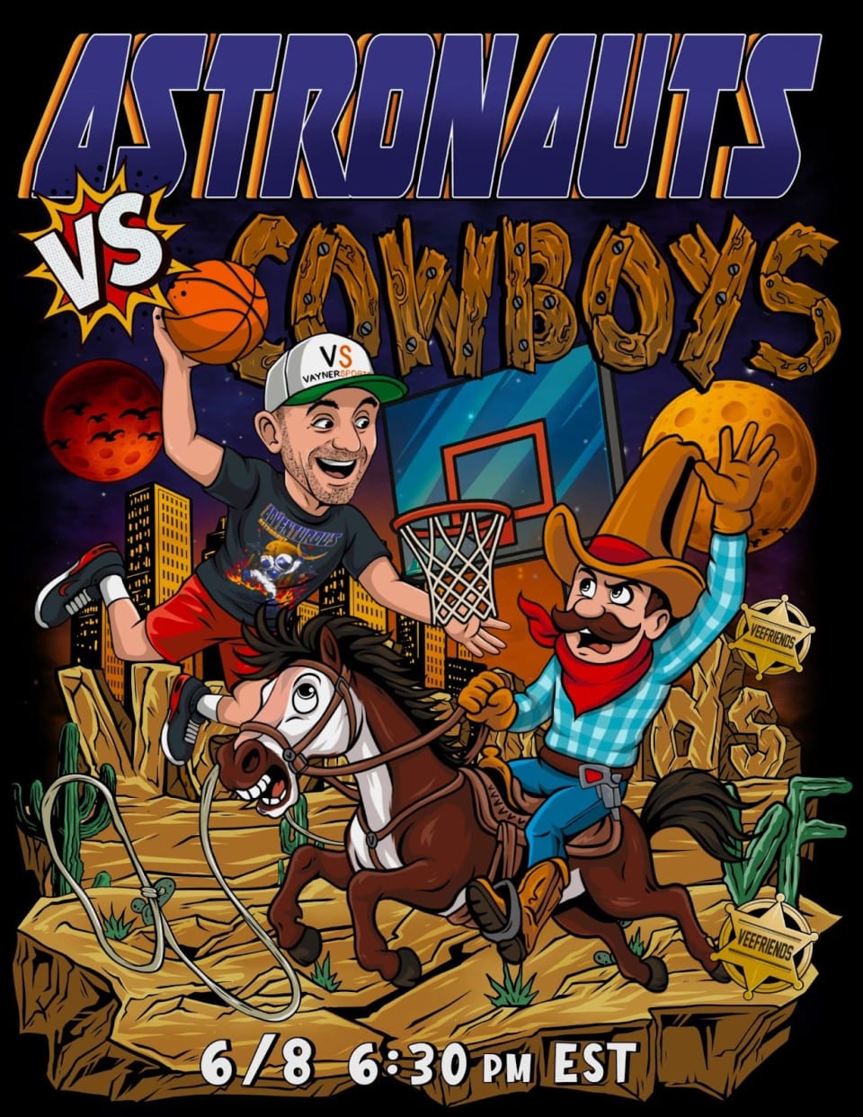 This Sunday at 6:30PM ET on Whatnot, watch the VeeFriends team take on Planet Euphoria in a live 4v4 basketball game while two limited-edition 555 Tees go up for grabs: the Adventurous Astronaut and Considerate Cowboy - available on this show only!