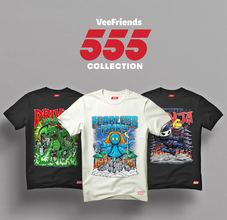The 555 Collection is a line of limited-edition retro graphic tees starring your favorite VeeFriends. Each design in this collection celebrates the important traits of VeeFriends in a classic, bold, serial-numbered style that makes every tee one of a kind. These releases are only available through livestream-exclusive sales.