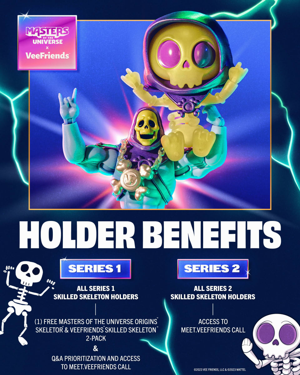 There will be two articulated figures created as part of this partnership. VeeFriends Skilled Skeleton and Masters of the Universe Origins Skeletor will be featured in a 2-Pack.